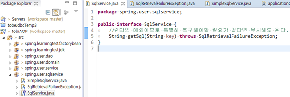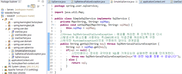 스프링 설정파일에 map으로 SQL을 셋팅하고, 아래처럼 SQL을 리턴하는데, SQL이 없으면 예외를 던지고, throws를 통해 메소드를 사용하는 쪽에서도 예외처리를 해줄 수도 있지만, 런타임 예외이므로 꼭 해야할 의무는 아님.