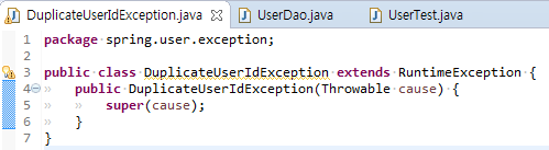 예외전환 : 원래 DuplicateUserIdException은 내가 만든 예외로 SQLException(체크예외) 에 속하지만, 계속 throws를 사용해 넘기는 건 무의미하다. 어짜피 복구 불가능한 예외라면 RuntimeException으로 포장해서 던져, 다른 계층의 메소드를 작성할 때 무의미한 throws 선언이 들어가지 않게 해줘야 한다.