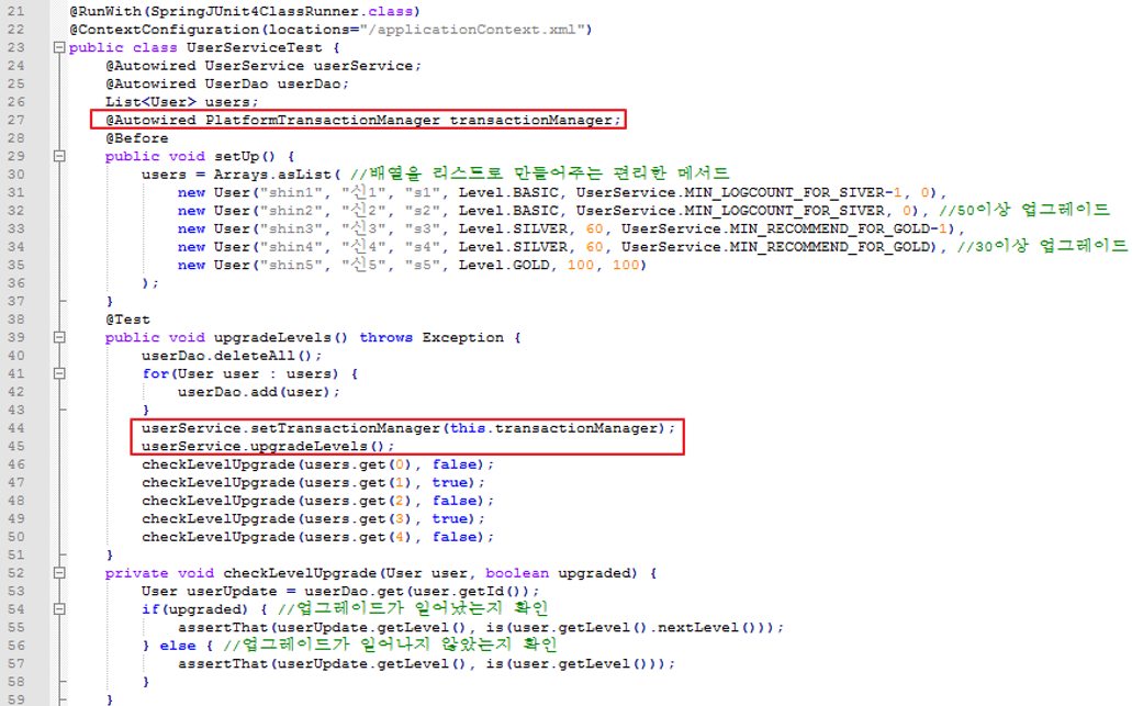 77. UserService에 주입한 트랜잭션과 동일한 트랜잭션을 testUserService에 주입. 스프링의 장점