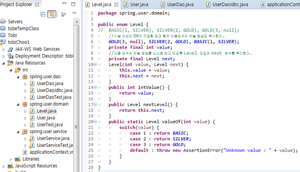 Level에게 다음 레벨에 대한 정보를 얻어 User객체에 세팅은 User에게 위임