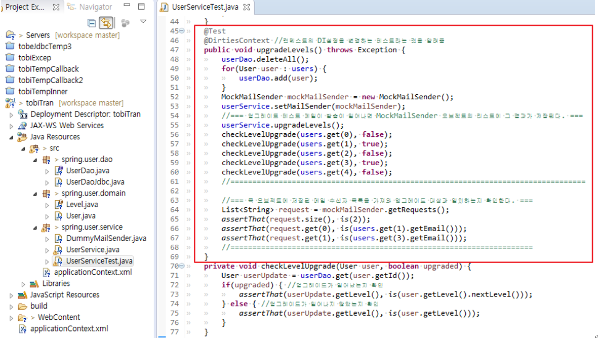 > 목 오브젝트(mock object) : 스텁처럼 테스트 오브젝트가 정상적으로 실행을 도와주면서, 테스트 오브젝트와 자신의 사이에서 일어나는 커뮤니케이션을 저장해뒀다가 테스트 결과를 검증하는데 활용(아래아래 MockMailSender 참조)