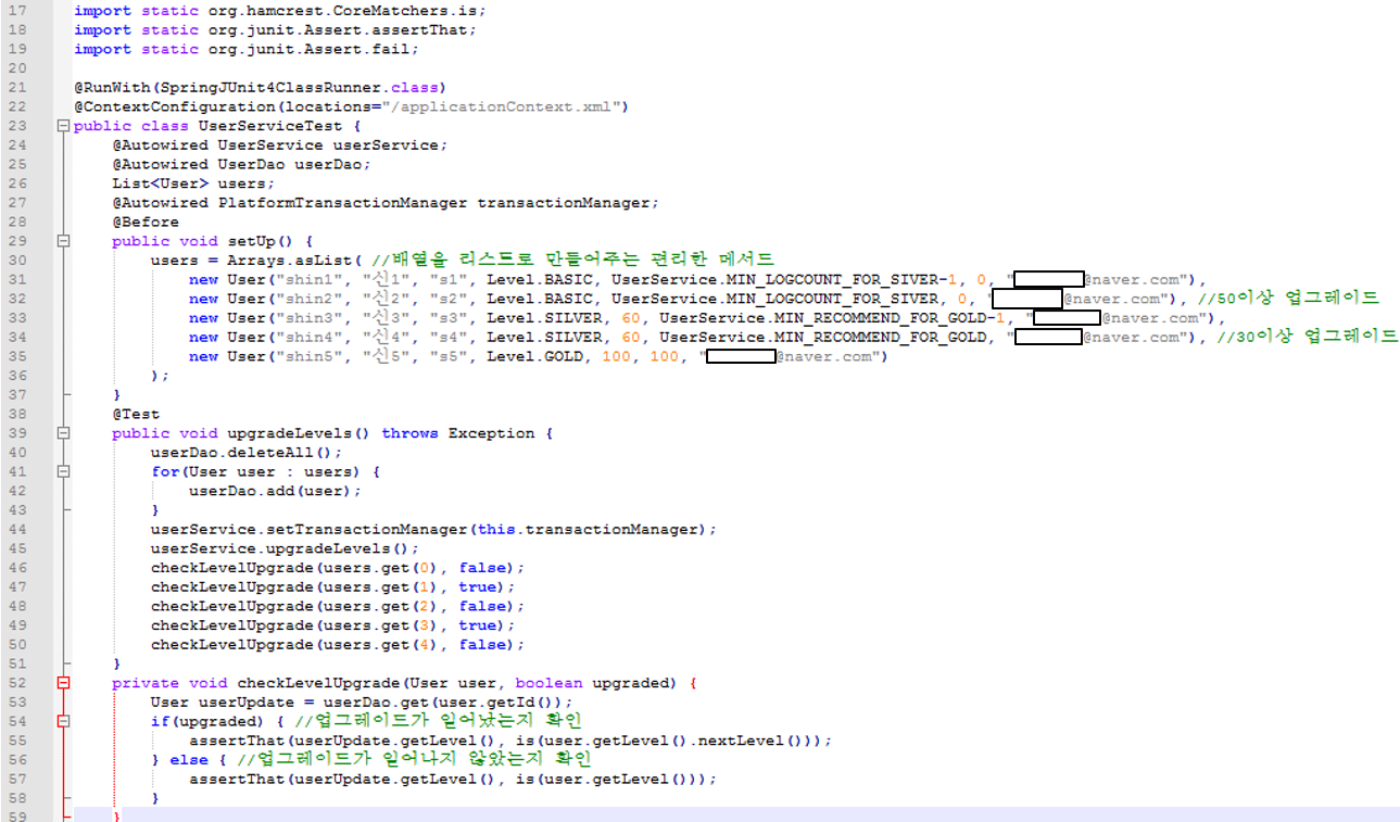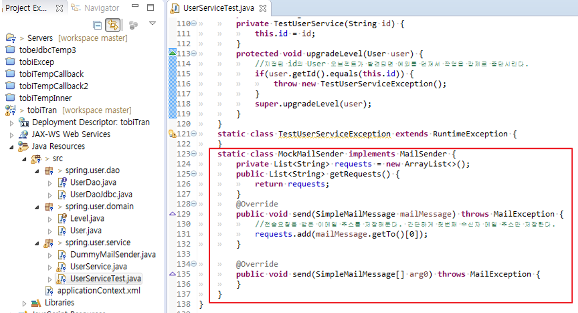 > 테스트스텁(test stub) : 테스트 대상 오브젝트의 의존객체로서 존재하면서 테스트 동안 코드가 정상적으로 수행할 수 있도록 돕는 것(DummyMailSender).