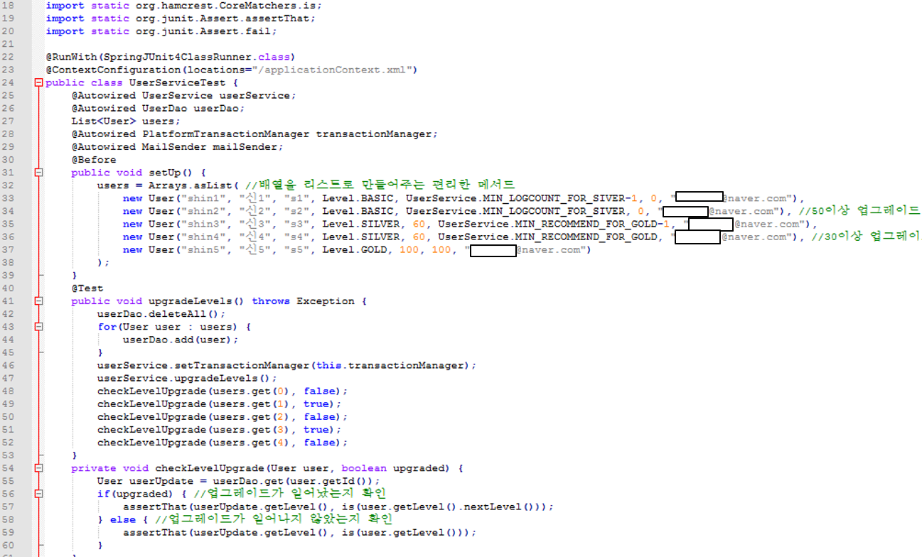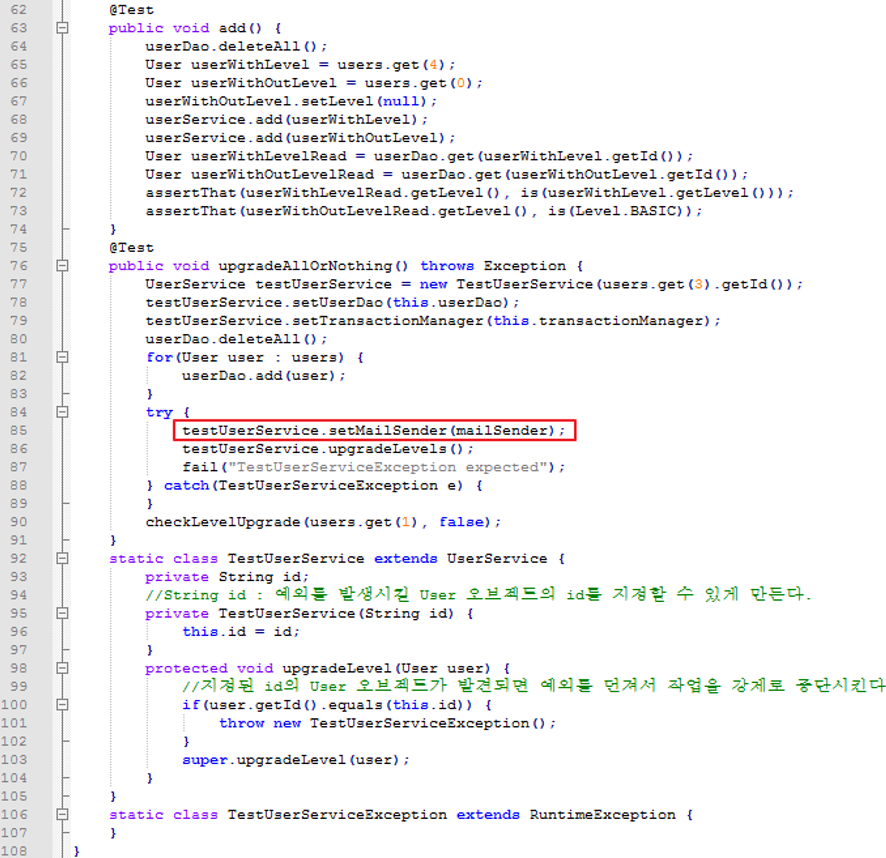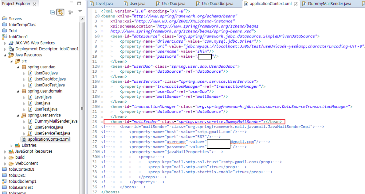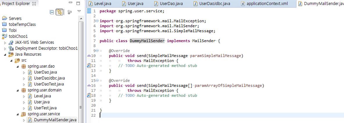> 테스트스텁(test stub) : 테스트 대상 오브젝트의 의존객체로서 존재하면서 테스트 동안 코드가 정상적으로 수행할 수 있도록 돕는 것(DummyMailSender).