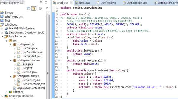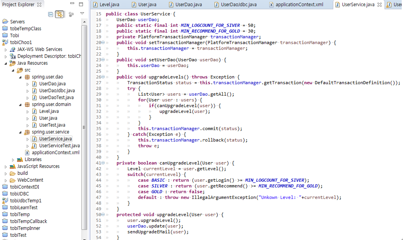Level에게 다음 레벨에 대한 정보를 얻어 User객체에 세팅은 User에게 위임