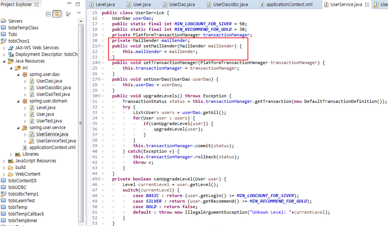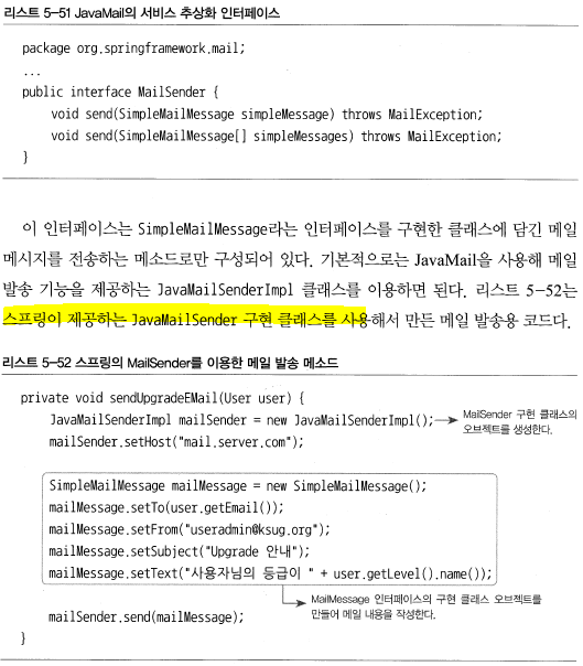 > 스프링이 직접 제공하는 MailSender를 구현한 추상화 클래스는 JavaMailServiceImpl 하나 뿐이지만, 이 추상화된 메일 전송 기능을 사용해 어플리케이션을 작성함으로써 얻을 수 있는 경우가 크다.