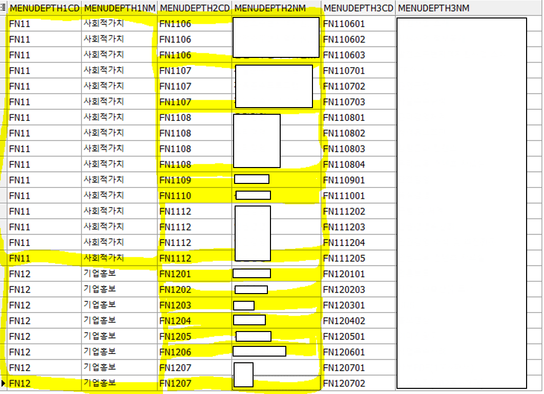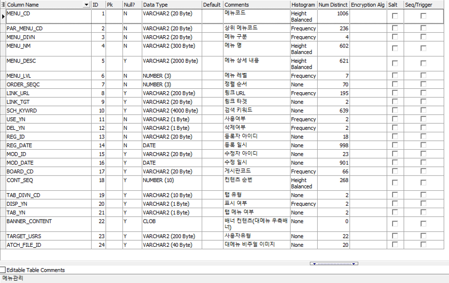 메뉴테이블 메뉴코드랑 상위메뉴코드는 필수고 나머지는 필요한대로