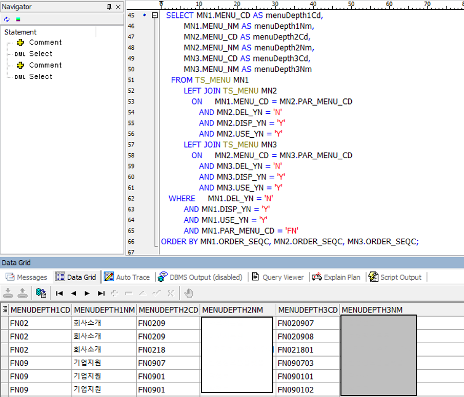 1. 메뉴들을 계층형 쿼리로 저장하여 셀프조인을 활용하여 1,2,3레벨의 메뉴를 조회한다.