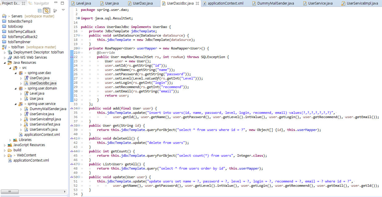 30. UserServiceImpl 을 가져온 이유는 MailSender를 DI 해줄 대상을 알고 있는 오브젝트를 가져온 것임.(application-context.xml, 53. MockMailSender 수정자메소드 DI)