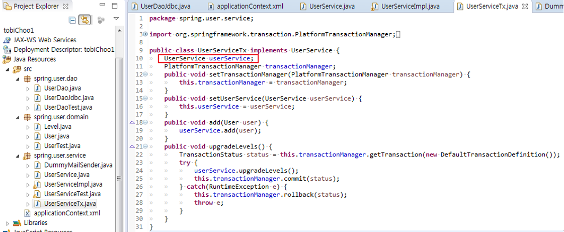 비즈니스 로직은 impl을 주입받아 그대로 사용하고 트랜잭션관련 로직만 추가시킴