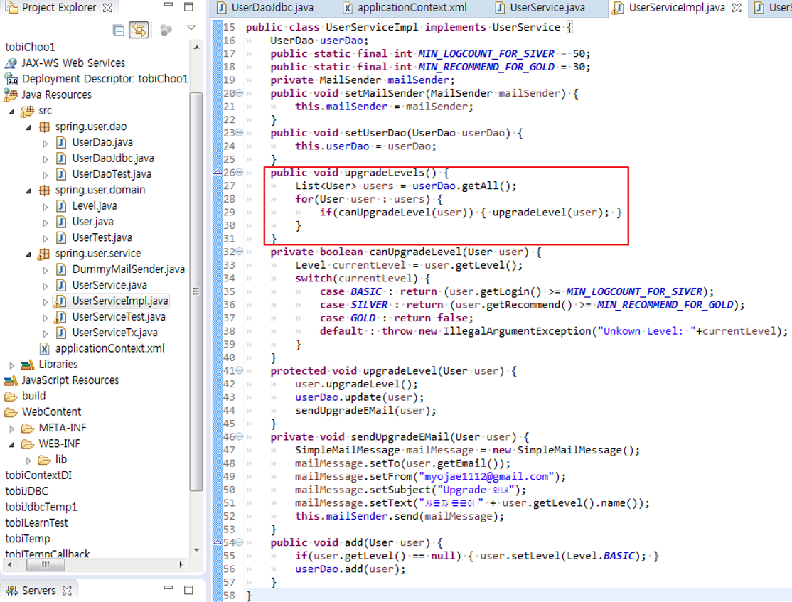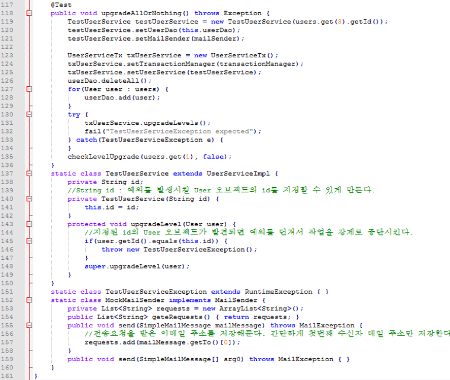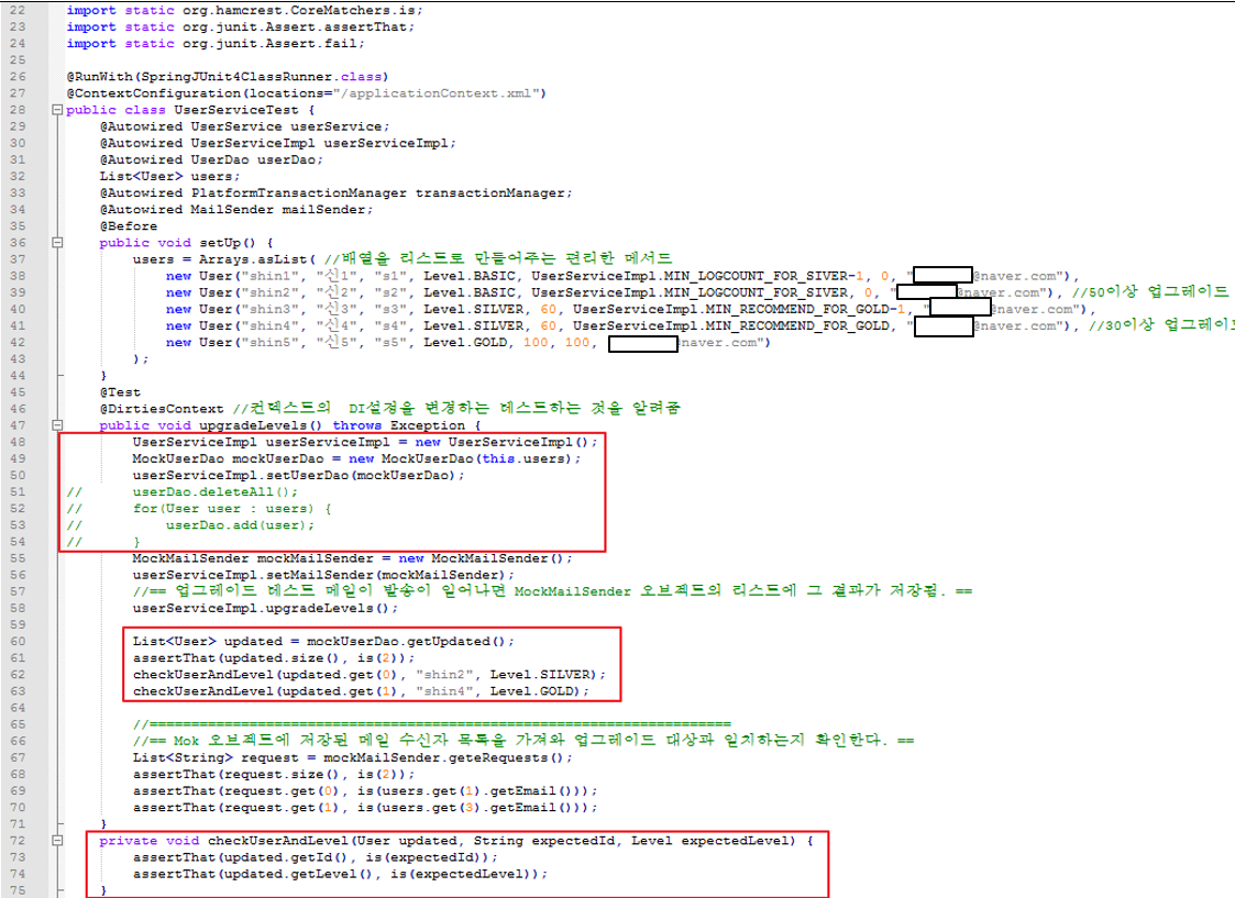 48. 고립된 테스트에서는 테스트 대상 오브젝트를 직접 생성. 기존 테스트에서는 컨테이너에서 가져온 UserService는 DI를 통해서 많은 의존 오브젝트와 서비스, 외부 환경에 의존하고 있었으므로, 완전히 고립돼서 테스트만을 위해 독립적으로 동작하는 테스트 대상을 사용할 것이기 때문에 새로 객체생성.(만약 upgradeLevels() 테스트만 있었다면 스프링 테스트 컨텍스트를 이용하기 위해 도입한 @RunWith 등은 제거할 수 있었다.)