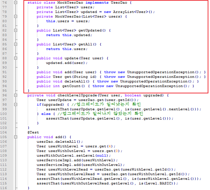 88. 목 오브젝트(Mock object, void update()) : 응답에 대한 확인 기능을 수행하는 역할. 업그레이드 대상 User 오브젝트를 저장해 뒀다가 검증을 위해 돌려주기 위한 기능.