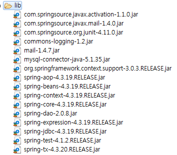 10. Spring-context : 스프링 코어를 확장한 많은 클래스가 들어 있는데 모든 클래스는 EJB, JNDI(Java Naming Directory Interface), JMX용 클래스와 연동하는데 applicationcontext기능을 사용해야 하며 스프링 리모팅 클래스, 동적 스크립팅 언어(제이루비, 그루비등)와 연동하는 클래스, 빈 유효성검증(JSR-303) API, 스케줄링을 하는 클래스도 포함되어 있다.