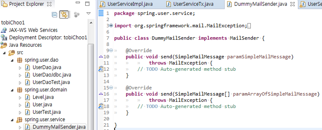 아무것도 안하는 메일센더 구현. 매 테스트마다 메일발송을 하면 과부하(stub)