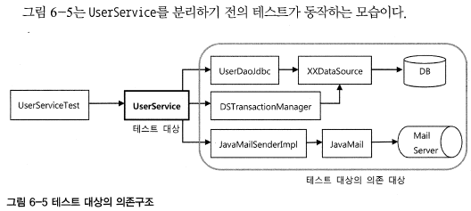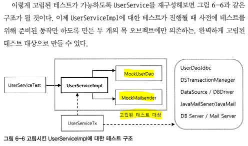 * 단위테스트 : 테스트 대상클래스(UserService)를 목오브젝트 등 테스트 대역을 이용해 의존 오브젝트나 외부의 리소스를 사용하지 않도록 고립시켜서 테스트 하는 것.