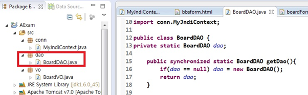 1) dao 클래스의 변수를 private로 함부로 못쓰게 막고, 생성된 싱글톤 오브젝트를 저장할 수 있는 static으로 static영역(로딩되면서 생성되어 프로그램이 종료되면 JVM에 해당 메모리를 반환)에서 공유한다.