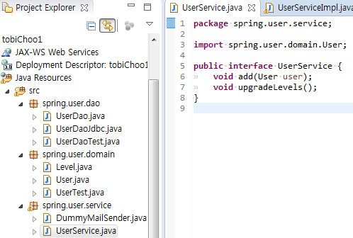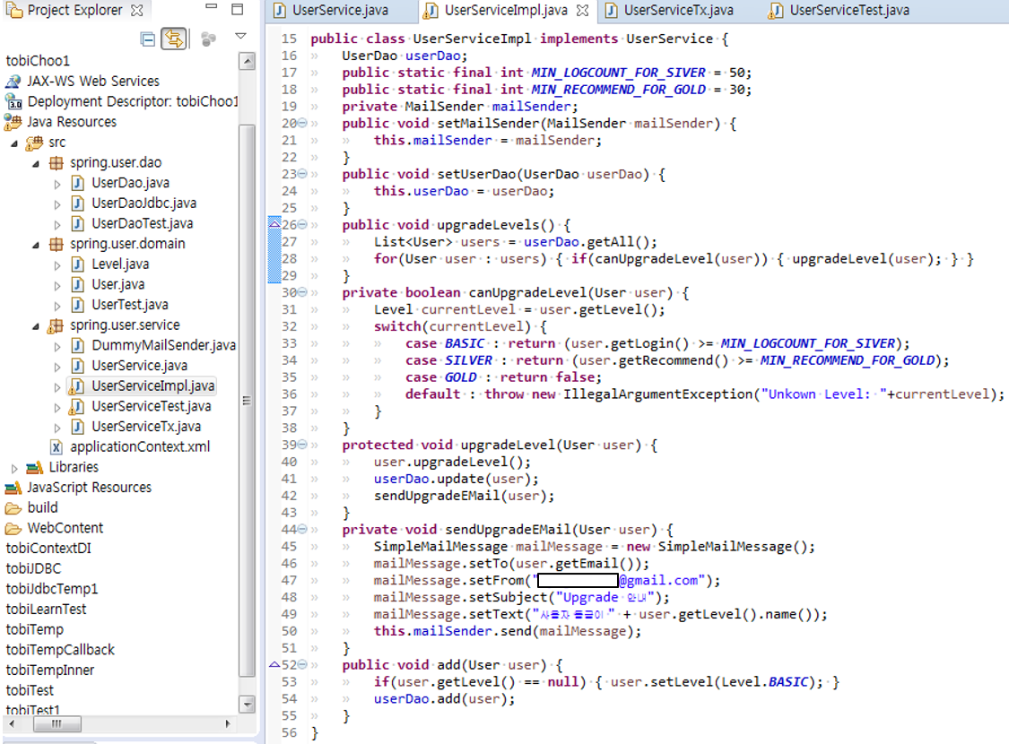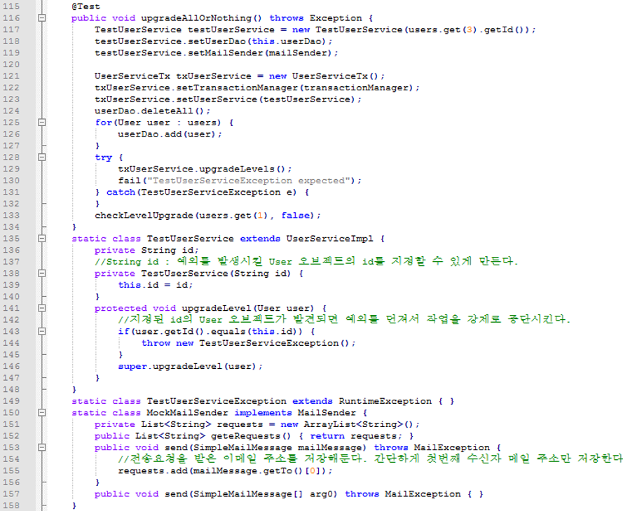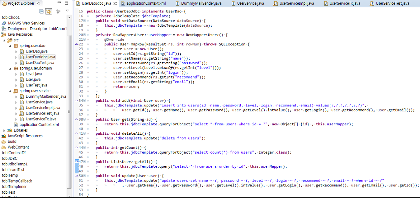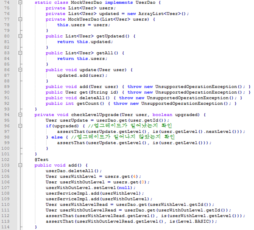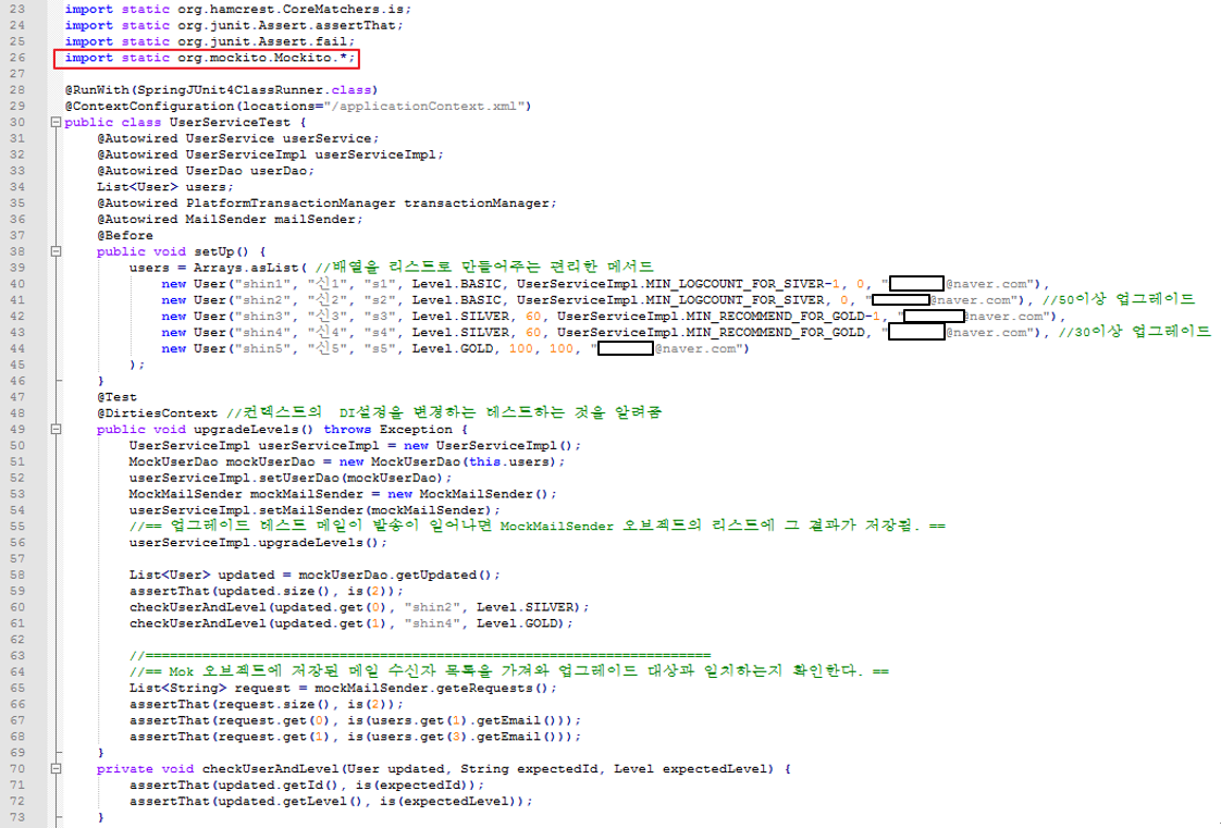 50~. DI 즉 통합테스트가 아닌 단위테스트를 위해 MockUserDao를 사용. New 를 통해 외부 환경에 주입된 빈이 아닌 독립된 테스트를 위해