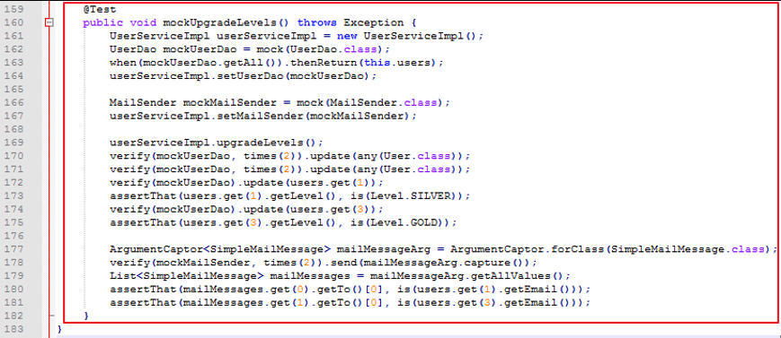 172. users.get(1)을 파라미터로 update()가 호출된 적이 있는지를 확인. Update()가 호출된 적이 없거나 파라미터가 users.get(1)이 아니었다면 테스트 실패