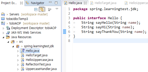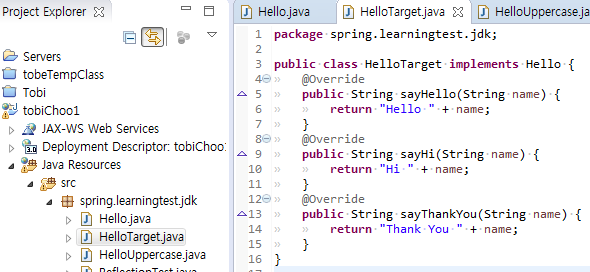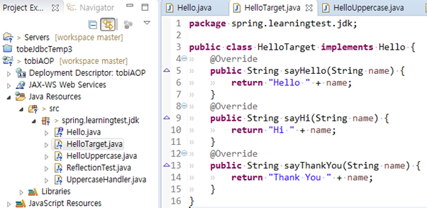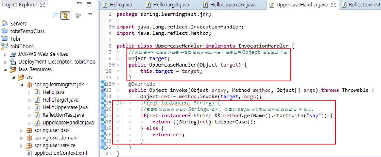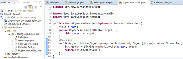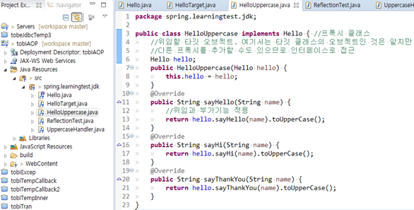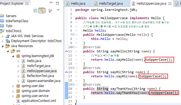 트랜잭션 경계설정을 분리하 듯이 대문자로 변환하는 로직도 인터페이스로 프록시와 타깃을 따로 구현하여 유지보수를 용이하게 할 수 있다.