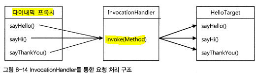 프록시 팩토리에게 다이내믹 프록시를 요청하면 Hello 인터페이스의 모든 메소드를 구현한 오브젝트를 생성해 준다. InvocationHandler 인터페이스를 구현한 오브젝트를 제공해주면 다이내믹 프록시가 받는 모든 요청을 InvocationHandler의 invoke 메소드로 처리한다.