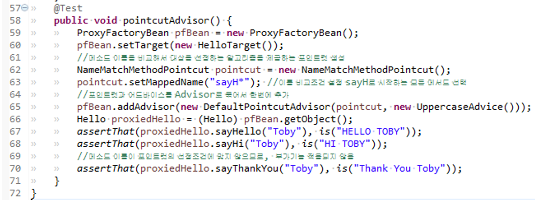 65. 포인트컷이 없을 땐 addAdvice() 메소드를 호출해서 어드바이스만 등록. 같이 등록시 addAdvisor()