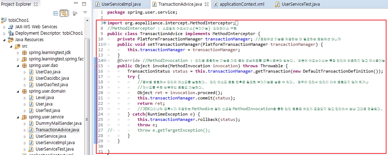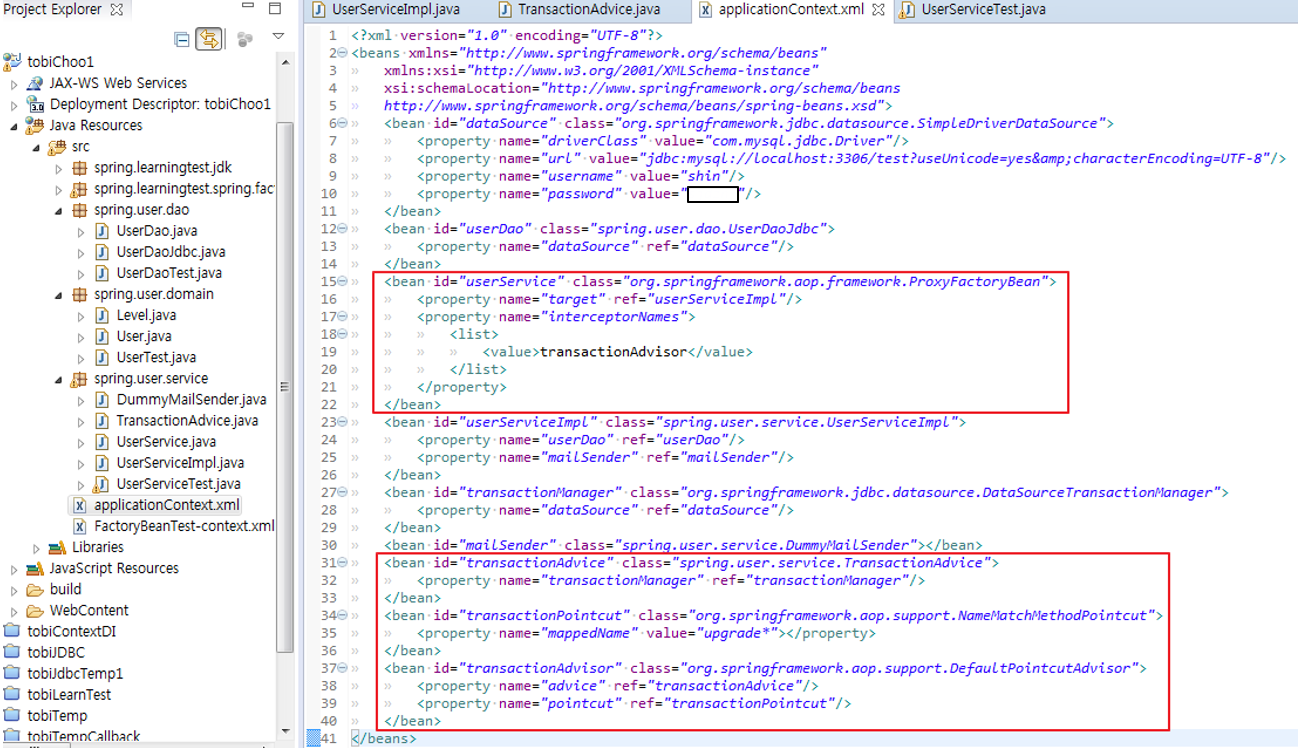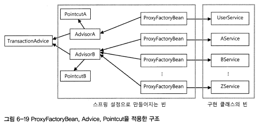 이렇게 ProxyFactoryBean을 이용해서 많은 수의 서비스 빈에게 트랜잭션 부가기능을 적용할 수 있다.