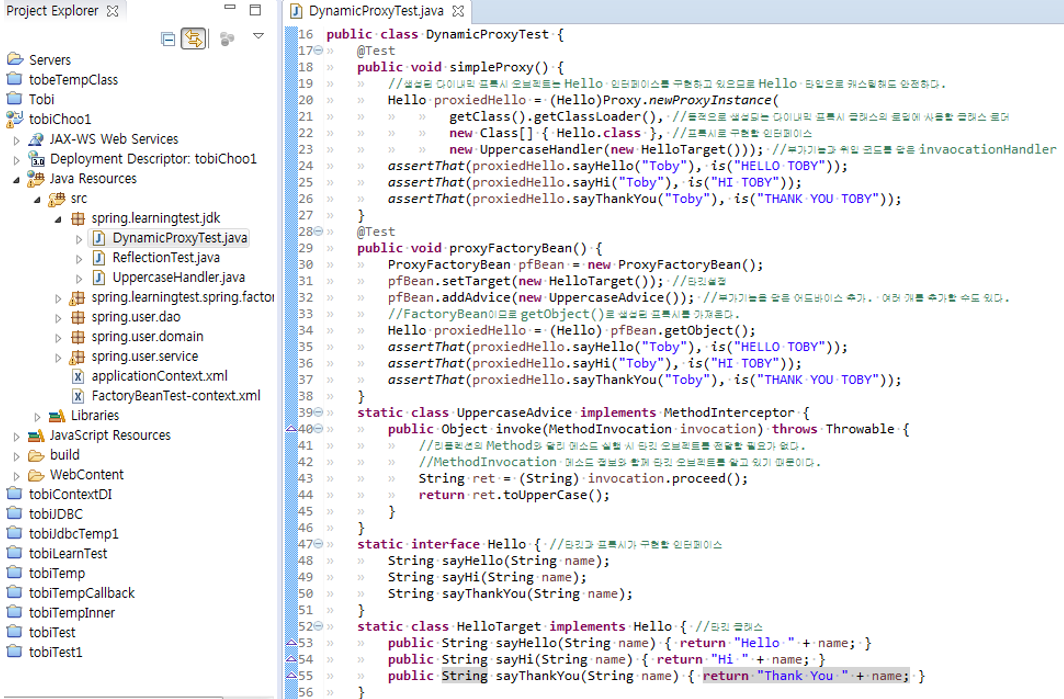 - 부가기능이 타깃 오브젝트마다 새로 만들어지는 문제 개선. 부가기능에 타깃을 set시키는 부분이 제거되고 ProxyFactoryBean에 타깃을 셋팅시키므로