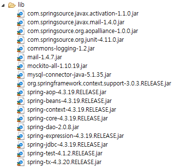 12. Spring-context : 스프링 코어를 확장한 많은 클래스가 들어 있는데 모든 클래스는 EJB, JNDI(Java Naming Directory Interface), JMX용 클래스와 연동하는데 applicationcontext기능을 사용해야 하며 스프링 리모팅 클래스, 동적 스크립팅 언어(제이루비, 그루비등)와 연동하는 클래스, 빈 유효성검증(JSR-303) API, 스케줄링을 하는 클래스도 포함되어 있다.