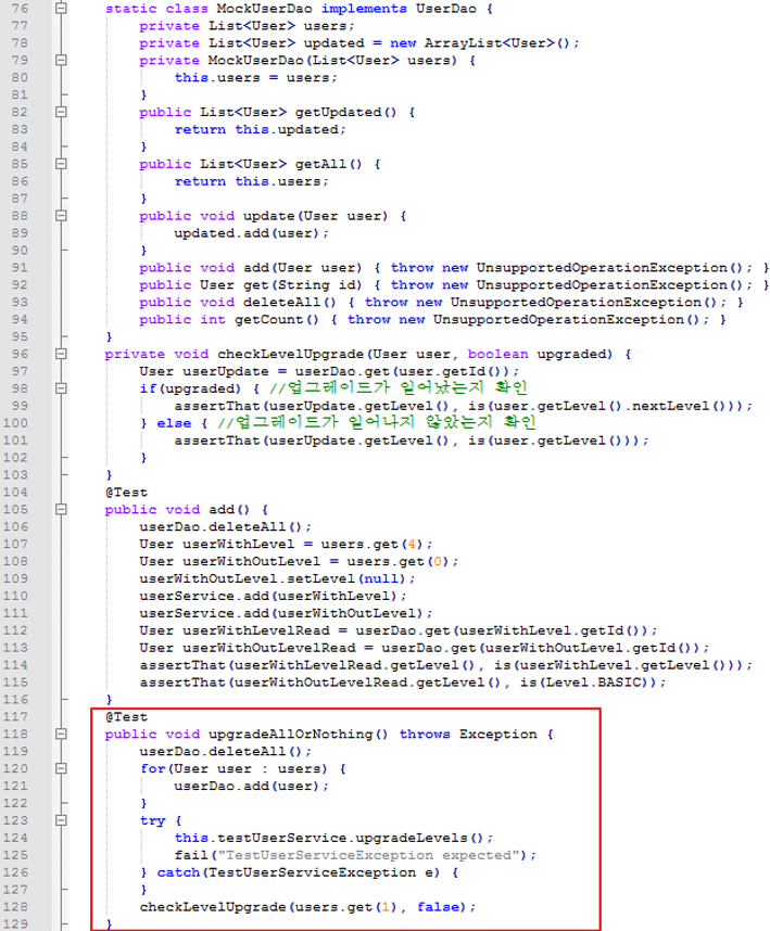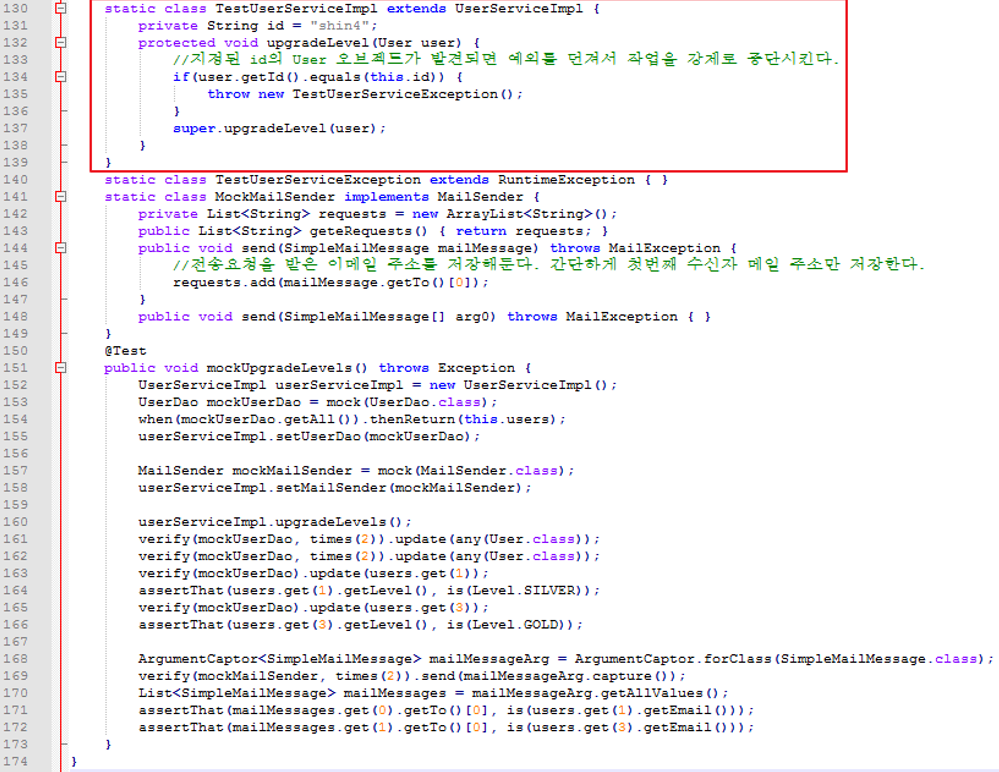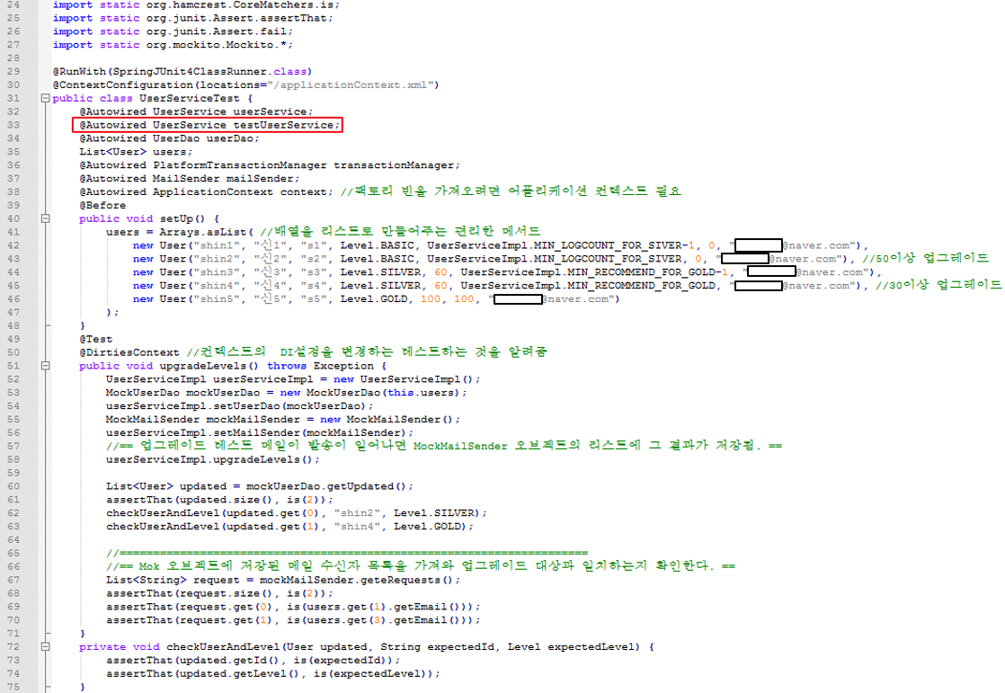 스프링 컨텍스트 빈 설정은 변경하지 않아도 되므로 @DirtiesContext 제거. DI 설정을 그대로 따르면 됨. UserServiceTestImpl가 bean으로 등록되었으므로