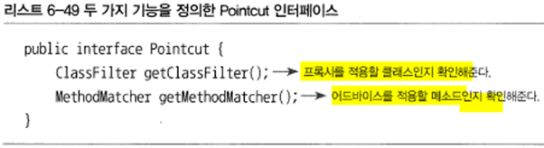 포인트컷은 클래스 필터와 메소드 매처 두가지 기능을 가지고 있음.