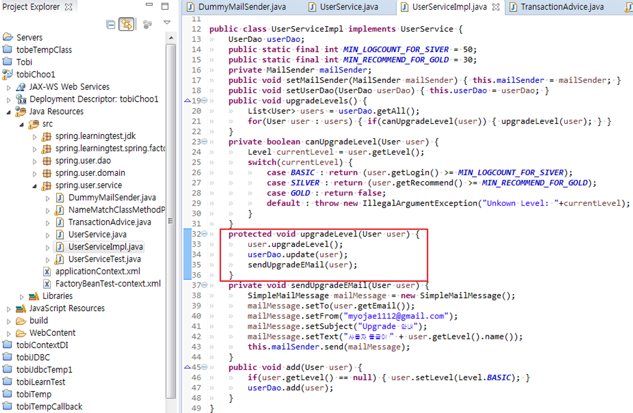 타깃 구현. 트랜잭션 프록시 적용이 필요한 upgradeLevel