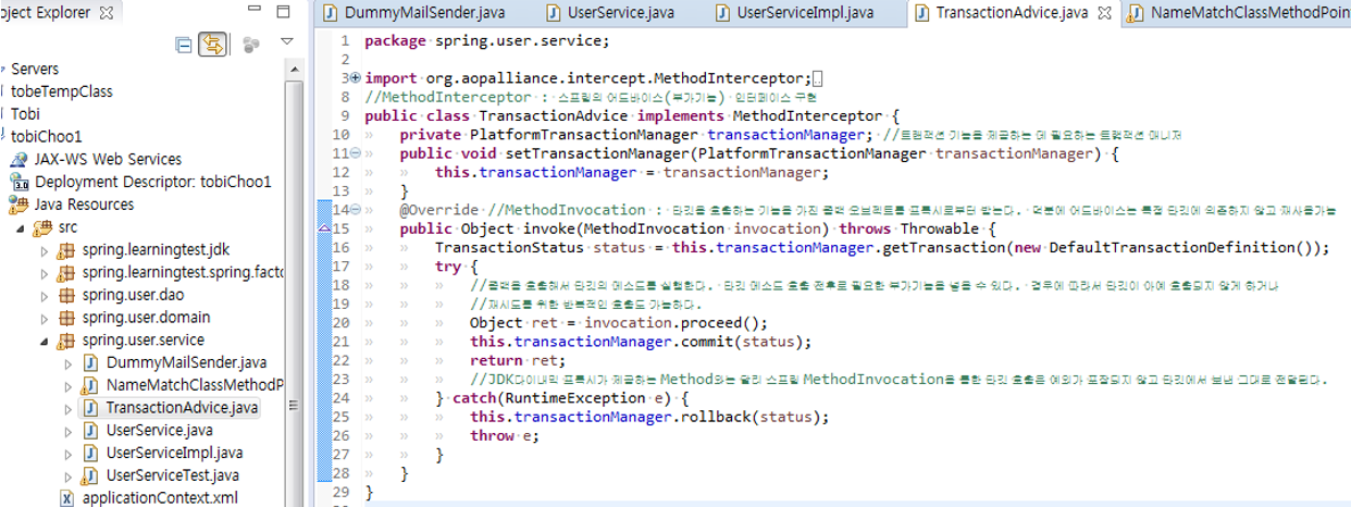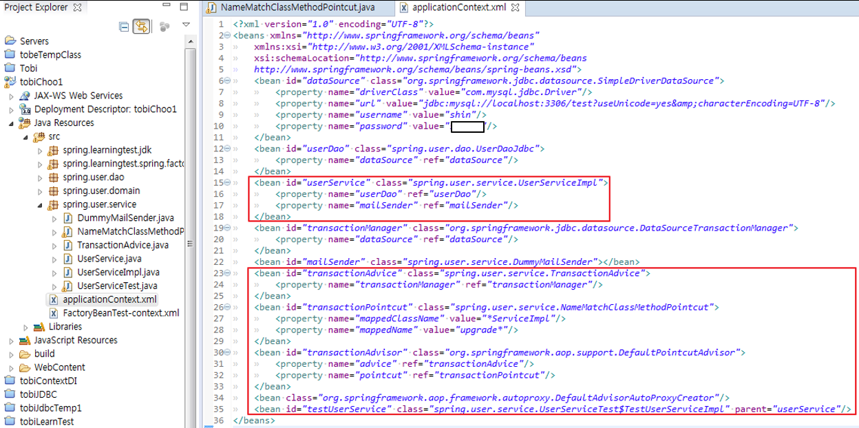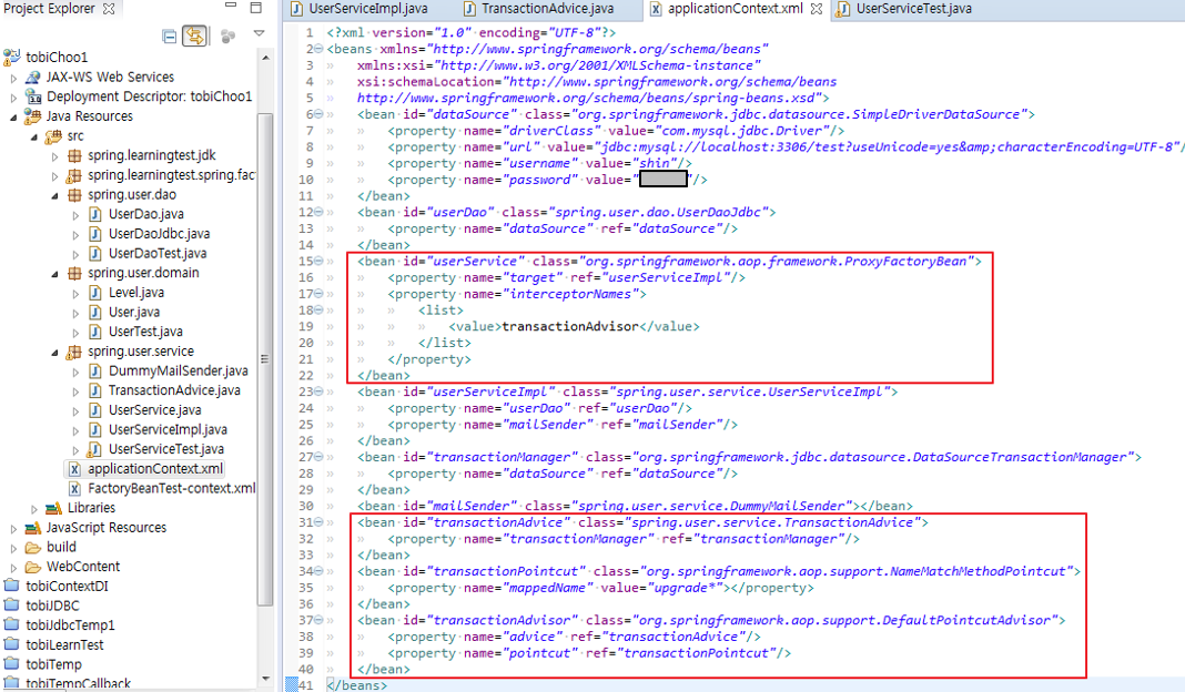 16. 현재 ProxyFactoryBean(userService)의 문제점 : target이 늘어남에 따라 ProxyFactory 설정이 늘어나야한다. 또한, 어드바이저를 동일하게 사용하는 target이 늘어남에도 같은 설정이 중복으로 들어가게 된다.