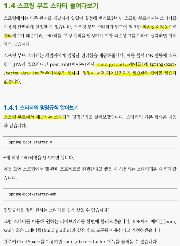 스프링 부트가 제공하는 스타터를 통해 일일이 어떤 라이브러리가 필요한지 찾아볼 필요가 없음. 의존성을 자동으로 해주기 때문