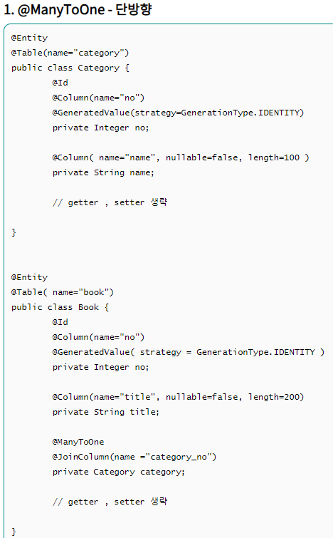 그래서 주인이되는(ForeignKey가 있는) Book 엔티티에만 @ManyToOne 어노테이션을 추가.
