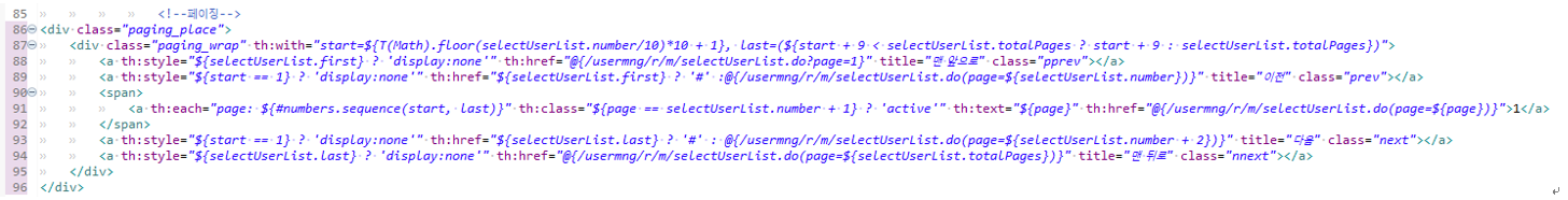 87. th:with : JSTL c:set의 대체자로 보면된다. start, last 변수를 생성한다.