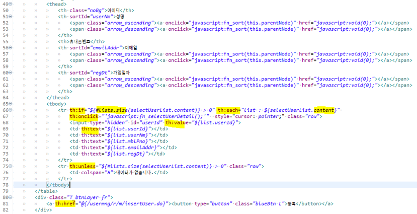 66. th:each : for문 변수는 list로 셋팅.
