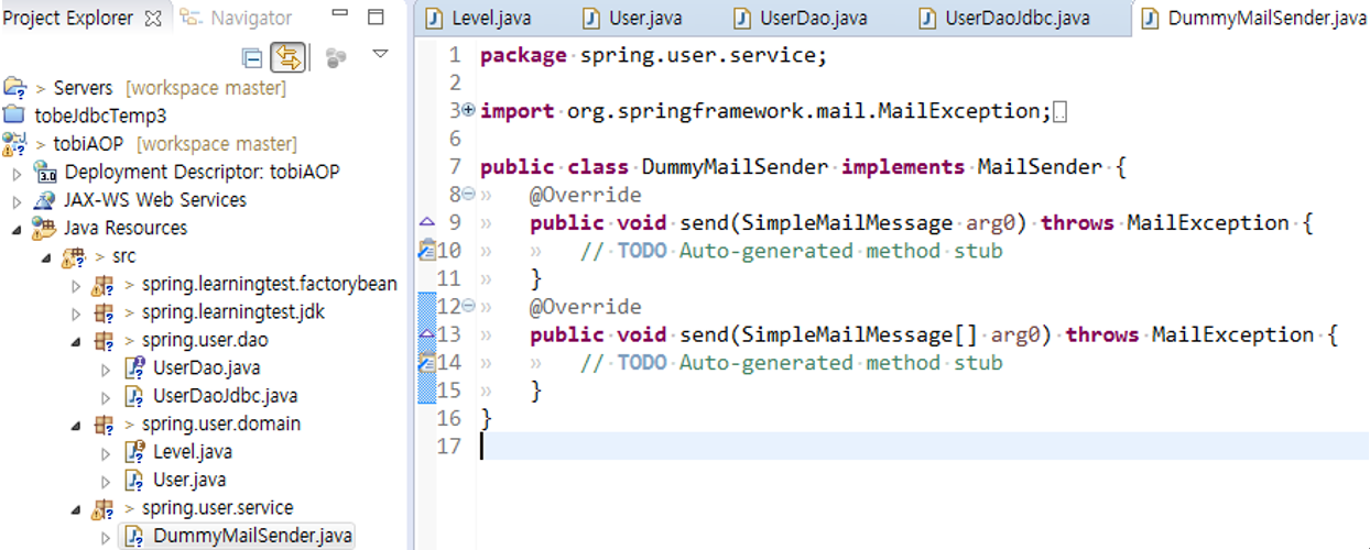 Target 클래스는 TargetInterface 인터페이스에 정의된 메소드를 구현한 4개의 메소드와 마지막 메소드는 Target 클래스에서 정의한 것(포인트컷 표현식을 이용해 원하는 메소드만 선정하는 방법을 알아보기 위함)