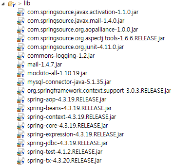 13. Spring-context : 스프링 코어를 확장한 많은 클래스가 들어 있는데 모든 클래스는 EJB, JNDI(Java Naming Directory Interface), JMX용 클래스와 연동하는데 applicationcontext기능을 사용해야 하며 스프링 리모팅 클래스, 동적 스크립팅 언어(제이루비, 그루비등)와 연동하는 클래스, 빈 유효성검증(JSR-303) API, 스케줄링을 하는 클래스도 포함되어 있다.