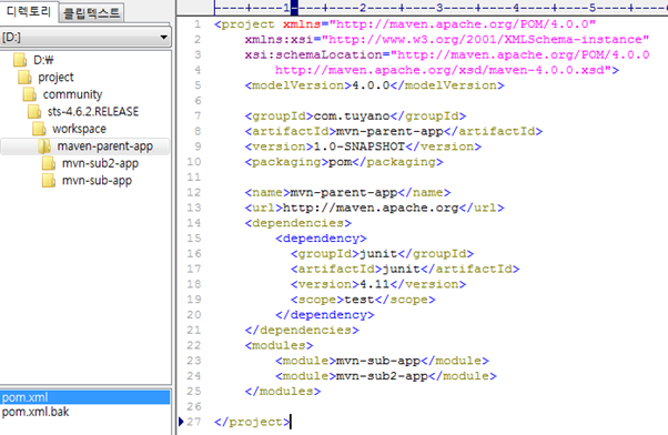 Maven-parent-app 디렉토리에 2개 이사의 프로젝트를 생성하고, pom.xml을 위와 같이 작성.