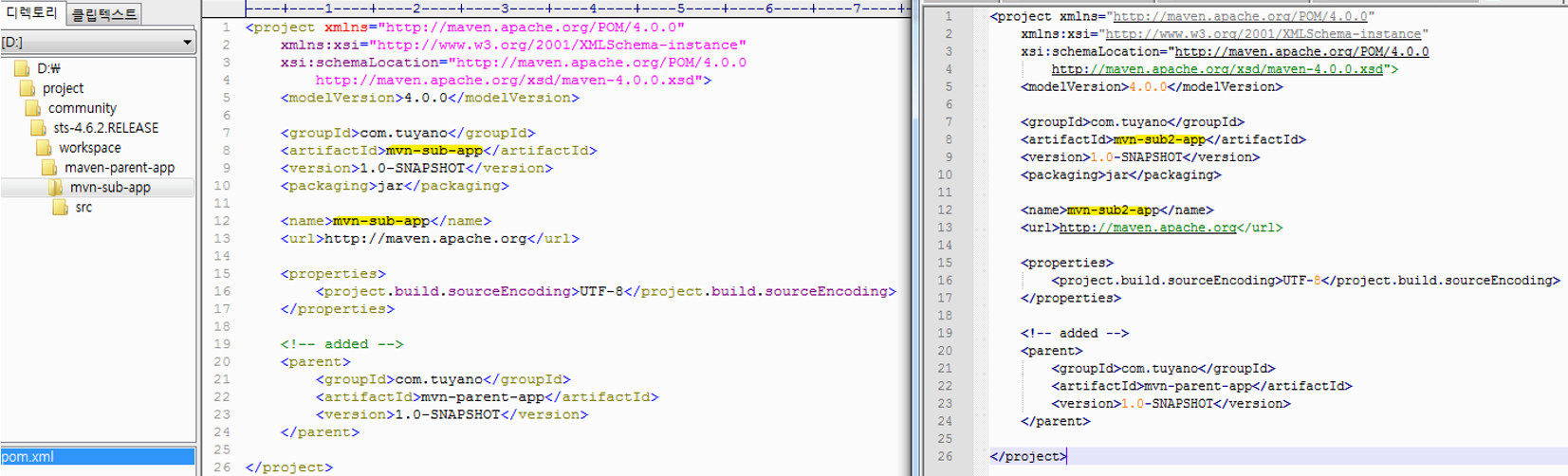artifactId 와 name 두 곳만 각각 mvn-sub-app와 mvn-sub2-app로 값이 다르고, 나머지는 동일