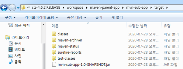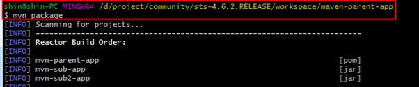 Mvn-parent-app 자체는 프로그램을 포함하지 않으므로 패키징하더라도 아무 영향이 없지만, 서브프로젝트가 자동으로 패키징된다.