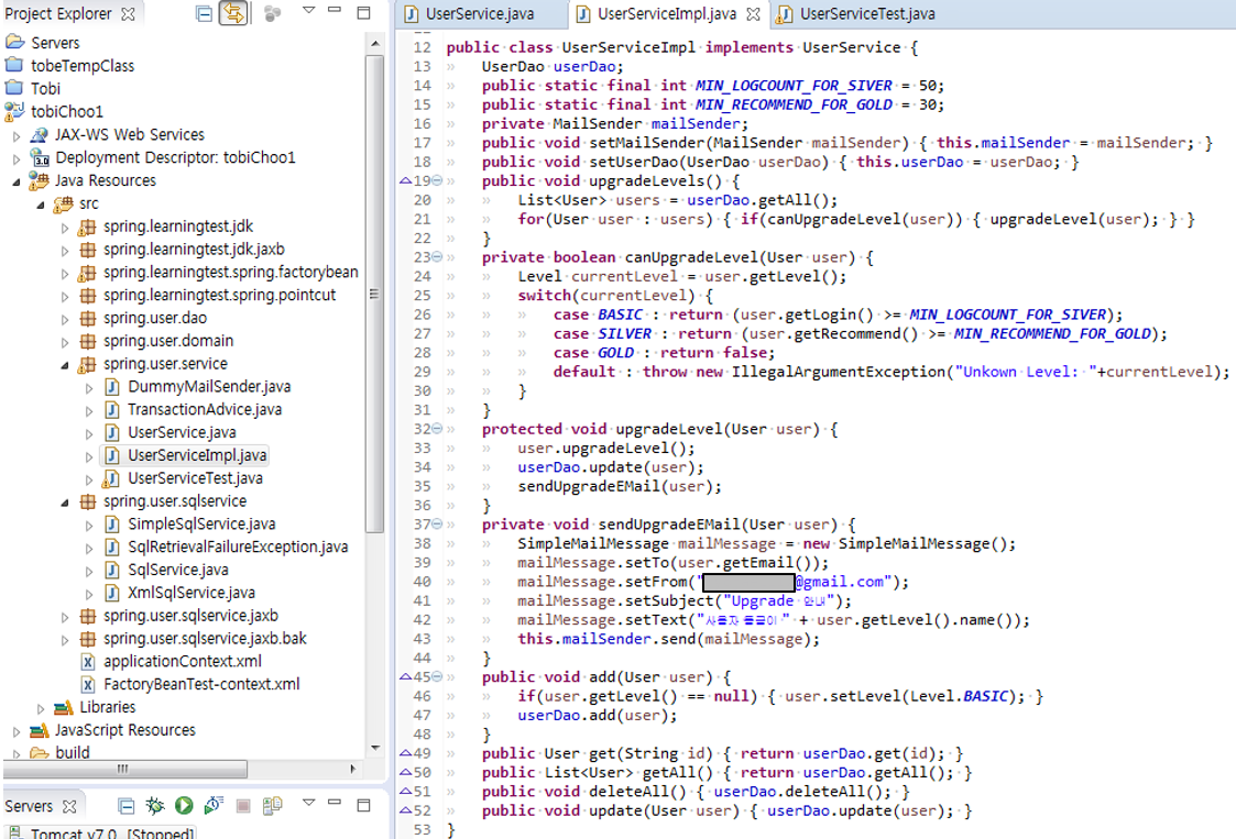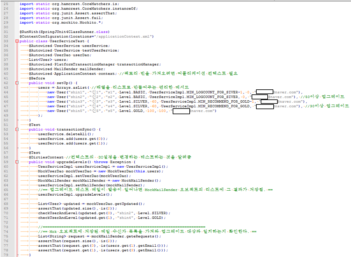 42. sqlMap 오브젝트는 SqlRegistry 타입 오브젝트를 통해서만 사용한다. 물론 XmlSqlService의 일부이므로 직접 접근이 가능하지만 다른 오브젝트라고 생각하고 인터페이스를 통해서만 사용.