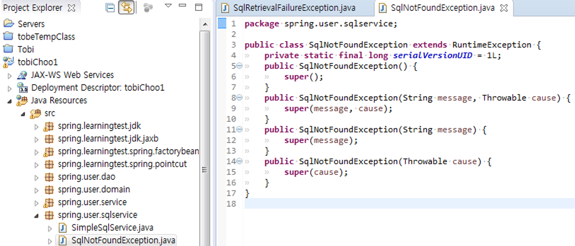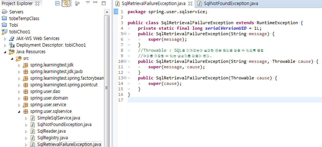 7. 검색의 경우 실패시 예외를 던지게 했다. 코드에 버그가 있거나 설정에 문제가 있기 때문에 발생할 수 있으니 복구할 가능성이 적다고 판단해서 런타임 예외로 만들었다. 하지만 여러 개의 레지스트리를 둬서 사용한다면 한 레지스트리에서 검색이 실패할 경우 다른 레지스트리에 검색을 시도할 수 있다. 재시도를 통해 예외를 복구할 수 있는 여지가 있는 셈이다. 따라서 이 메소드를 사용해서 만드는 코드가 그 가능성을 확인할 수 있도록 런타임 예외이지만 명시적으로 메소드가 던지는 예외를 선언해두는 편이 좋다.