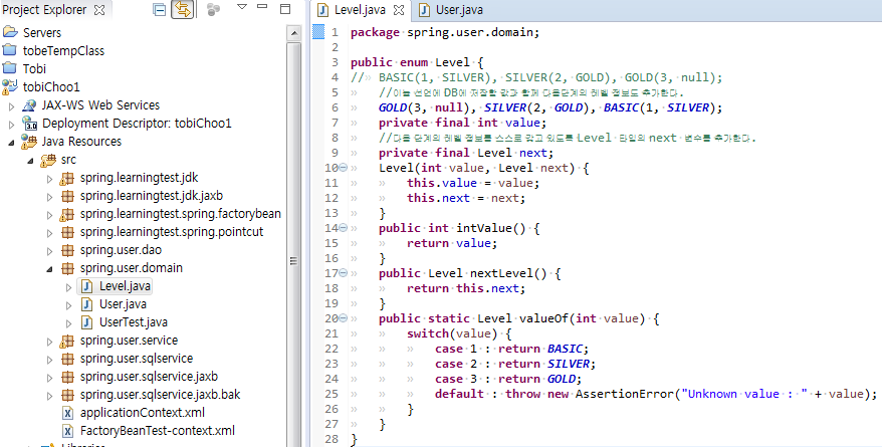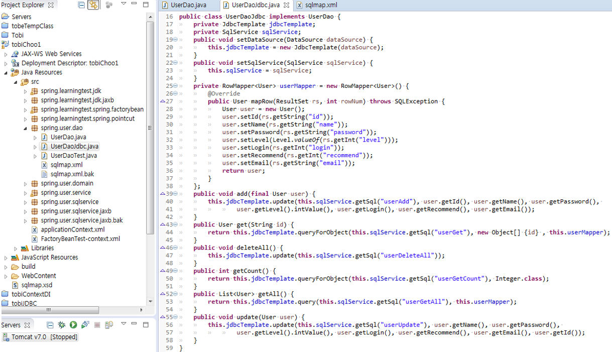 69. 이렇게 등록을하면 불필요하게 Map등의 특정 오브젝트로 변환할 필요 없이 SqlRegistry에 등록된다. > 자바의 오브젝트는 데이터를 가질 수 있다. 이렇게 자신의 데이터를 이용해 어떻게 작업해야할 지도 자신이 가장 잘 안다. 그러므로 자신의 오브젝트를 외부에 노출시킬 필요는 없는 것이다. SqlRegistry에서 Map으로 작업을 하면 된다.