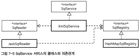 18~19. XmlSqlService가 SqlService만을 구현한 독립적인 클래스라고 생각했을 때 SqlReader와 SqlRegistry 두 개의 인터페이스 타입 오브젝트에 의존하는 구조가 되어야 한다.