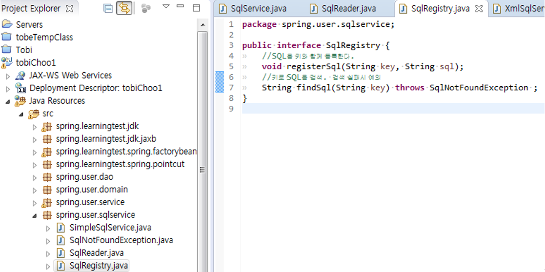 5. registerSql : SqlRegistry가 구현한 인터에이스에 등록을 위한 메소드 제공해두면 SqlService코드를 통해 특정 포맷으로 변환한 SQL정보를 주고받을 필요 없이 SqlReader가 직접 SqlRegistry에 SQL 정보를 등록할 수 있다.