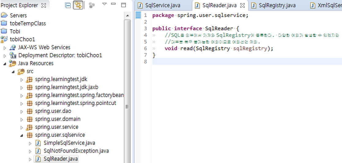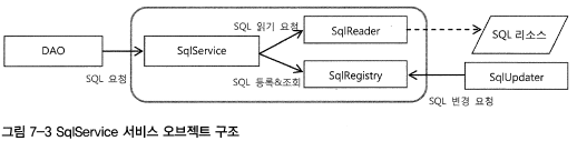 * SqlReader는 내부에 갖고 있는 SQL 정보를 돌려주는 대신 SQL을 등록하는 SqlRegistry에게 필요에 따라 read 메소드를 통해 읽어 등록해 주면 된다.(자신의 일은 자신이 남의 일은 위임)