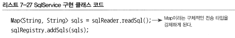 SqlReader가 리소스로부터 읽어온 SQL 정보를 맵으로 돌려준다고 정의하면 SqlService 구현 클래스에는 위와 같은 코드가 만들어 질 것이다.