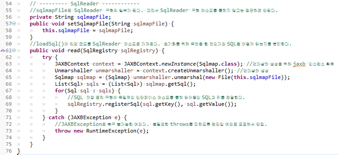 - JAXB를 사용한 SqlReader라면 Sqlmap과 Sql 타입의 오브젝트로 SQL 정보를 읽어오는데 이를 다시 Map으로 옮겨 담아서 리턴해줘야 하기 때문이다.