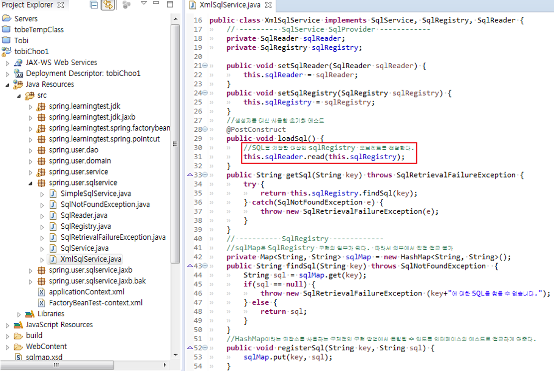 29. loadSql을 통해 초기화시 SqlReader를 활용하여 SqlRegister의 Map에 저장. 이 때 SqlReader를 독립적인 오브젝트라고 생각하고(SqlRegistry도 동일) 구현 메소드를 사용해야한다. 직접 메소드를 통한 접근은 안된다. 서로 독립되어 의존하는 관계(객체지향)
