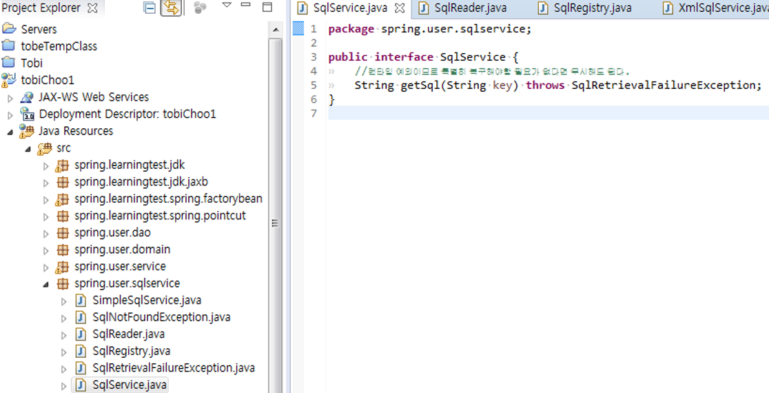 43. 기존에는 XmlSqlService가 XML 파일을 읽어오는 방법과 저장 방법을 모두 알고 있었다. 이제는 SqlReader 메소드 뒤로 숨기고, 어떻게 저장해둘지는 SqlRegistry 타입 오브젝트가 알아서 처리하도록 변경
